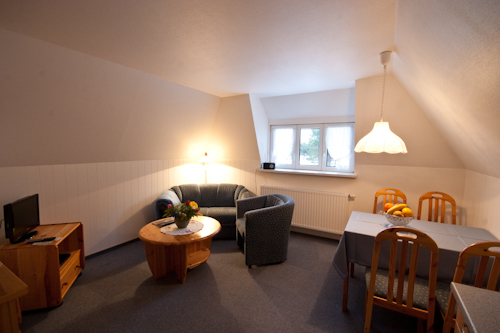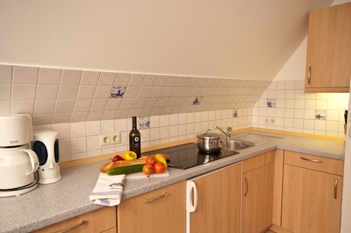 - 1 Wohnraum mit Essecke und Kochzeile mit Ceranfeld und GeschirrspĂĽler